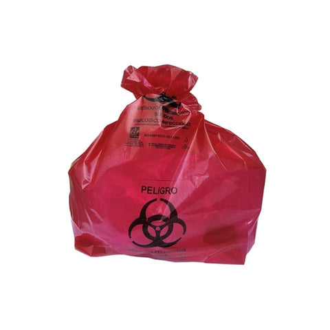 Bolsa para desechos fabricada en polietileno de baja densidad, libre de metales pesados. Ideal para la recolección de desechos biologico infecciosos como jeringas, guantes, gasas, apósitos, sondas, pañales, ropa desechable, etc. todos los materiales que contengas sangre o fluidos corporales. Utilizada en ambulancias, laboratorios, clínicas, consultorios, hospitales,hospitales veterinarios, centros de salud, granjas, rastros, criaderos, centros de reproducción. Color rojo con leyenda universal de residuos peligrosos. Medida 55 cm x 60 cm. Presentación 100 piezas.
