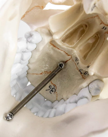 La conexión de la cara con la mandíbula esta fijada con clavos de acero, por lo que toda la estructura del cráneo es estable y no se suelta.