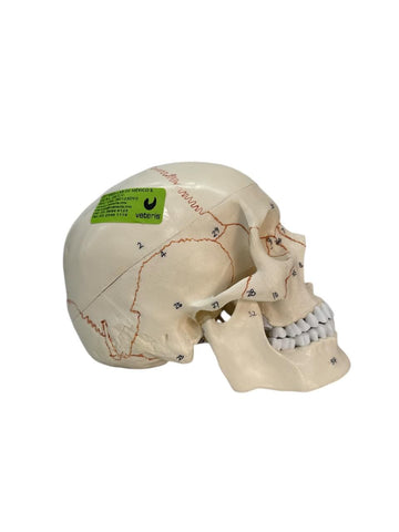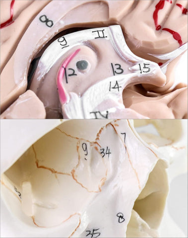 Este modelo cerebral cuenta con un diagrama en ingles etiquetado para 32 marcadores numéricos. El modelo de cráneo incluye un diagrama etiquetado en ingles para 55 marcadores numéricos.