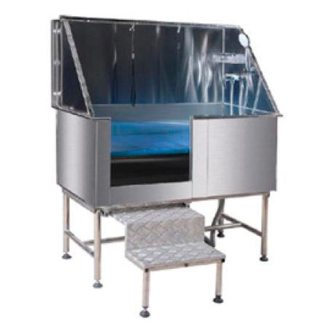 Bañera de acero inoxidable con puerta de acceso y escalera antiderrapante. Utilizada en estéticas caninas y veterinarias, equipada con regadera de ducha para uso móvil o fijo, llaves para agua caliente y fría. Incluye rejilla de aluminio que separa el animal del suelo de la bañera, para un enjuague rápido y mejor higiene.