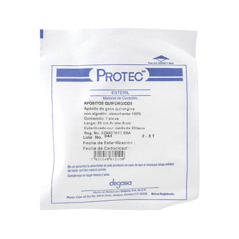 Apósito quirúrgico de 100% algodón estéril. Medida 20 cm x 8 cm. El apósito brinda a la herida un ambiente óptimo preservando los principios fisiológicos básicos de humedad, calor, oxigenación y circulación sanguínea en heridas de cualquier tipo como húmedas, secas, infectadas, no infectadas, neuróticas, sucias, limpias, etc. ya que cubre las heridas sin perder contacto con el aire y gracias a su máxima absorbencia elimina las secreciones. Utilizado en ambulancias, laboratorios, clínicas, consultorios, hospitales, escuelas, industria, centros de salud. Los apósitos también se emplean en hemorragias graves para ayudar en el proceso de coagulación, ejerciendo presión sobre la herida. Presentación pieza.