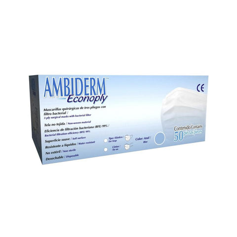 Mascarilla quirúrgica de tres pliegos con filtro antibacterial (BFE) 99%. No estéril. Desechable. Elaborado de tela no tejida (TNT). Suave y resistente a líquidos. Presentación 50 piezas.