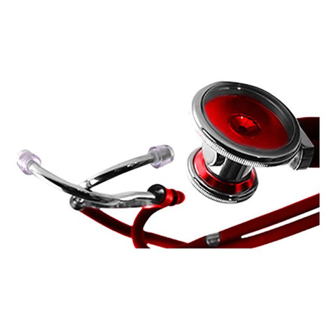 Estetoscopio VMLE3-5 color rojo. Manguera dual de silicon. Campana doble, cromada y con doble membrana. Olivas con rosca. Incluye set de refacciones: 3 campanas (pediatrico/neonatal/pinar) 1 juego de membranas. 2 juegos de olivas.