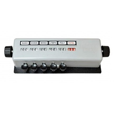 Contador mecánico para células. Capacidad hasta 999. Las teclas tienen una etiqueta para identificar la célula a contar, incluye totalizador y una perilla para restaurar a cero. Fabricado en plástico de alta resistencia química.