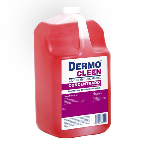 Cloruro de benzalconio Dermocleen concentrado solución gran positivo que actúa como desinfectante y sanitizante con acción anti microbiana. Uso directo en la desinfección de instrumental quirúrgico, utensilios, muebles, quirófanos, ambulancias, laboratorios, clínicas, consultorios, hospitales, hospitales veterinarios, centros de salud, etc. Contenido 4 litros.